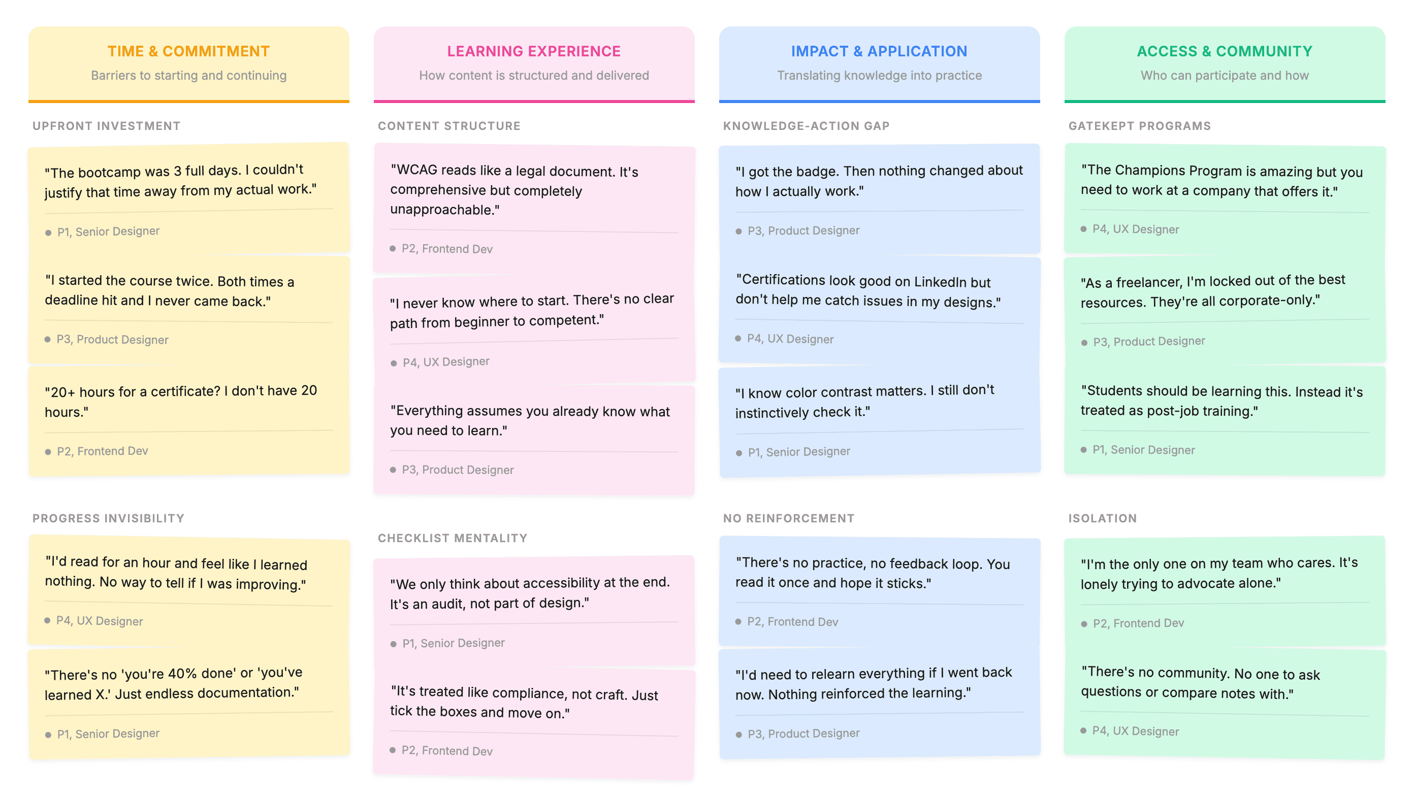 This reframed the entire exploration. Accessibility education didn't need clearer guidelines. It needed a better learning experience.