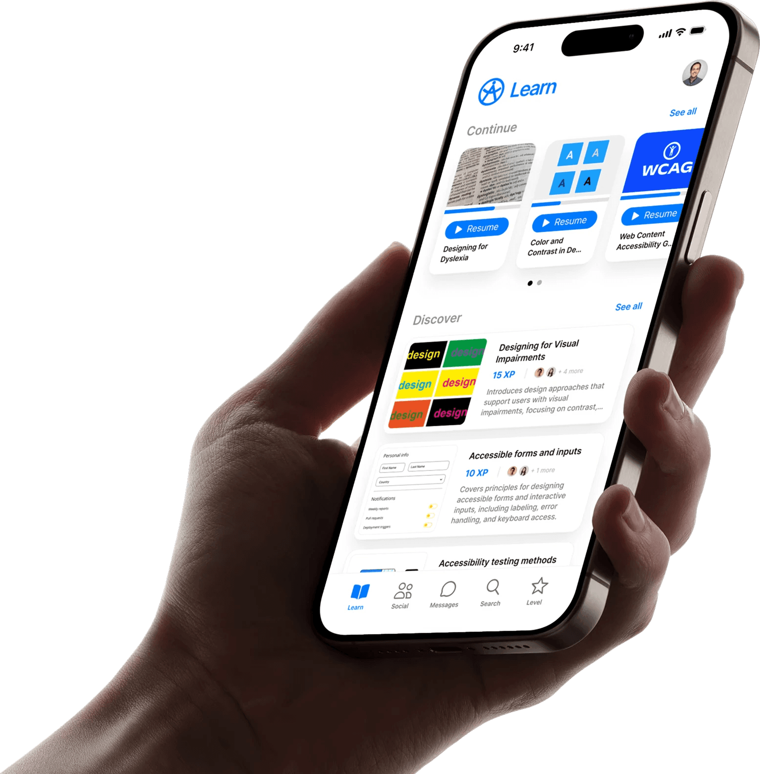 A mobile-first learning platform based on the Accessibility Champion program, with XP-based progression, role-specific content paths, and community features that make learning accessibility feel like leveling up in a game.